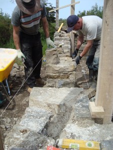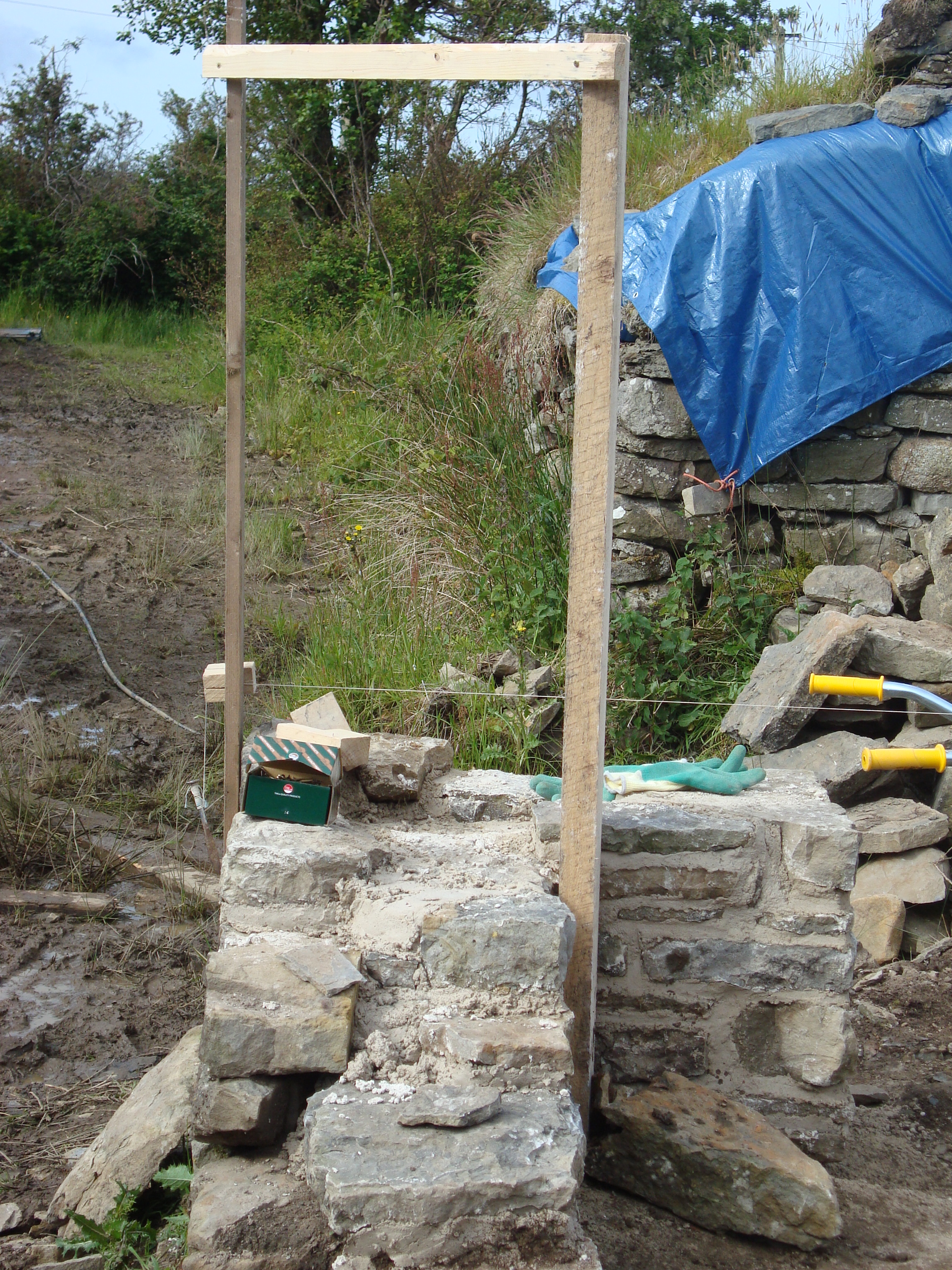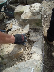 Both verticals are plumb to the wall, held steady by a rock. A corner block holds the line taut. We have to check those profiles regularly to make sure they haven’t shifted accidentally (or from silly people leaning against them). It’s essential that the wall is built on both faces simultaneously, otherwise it will not bond rightly.