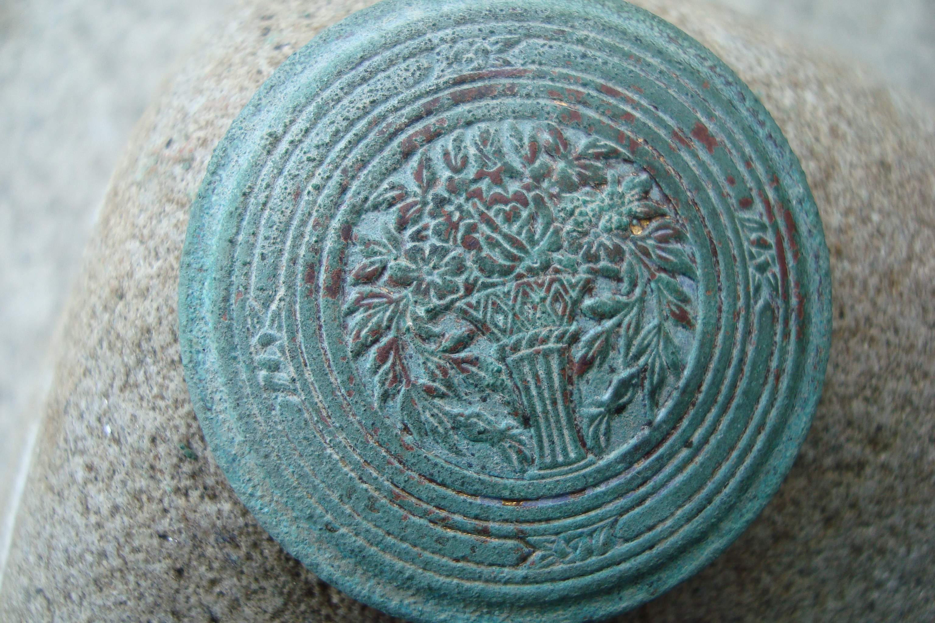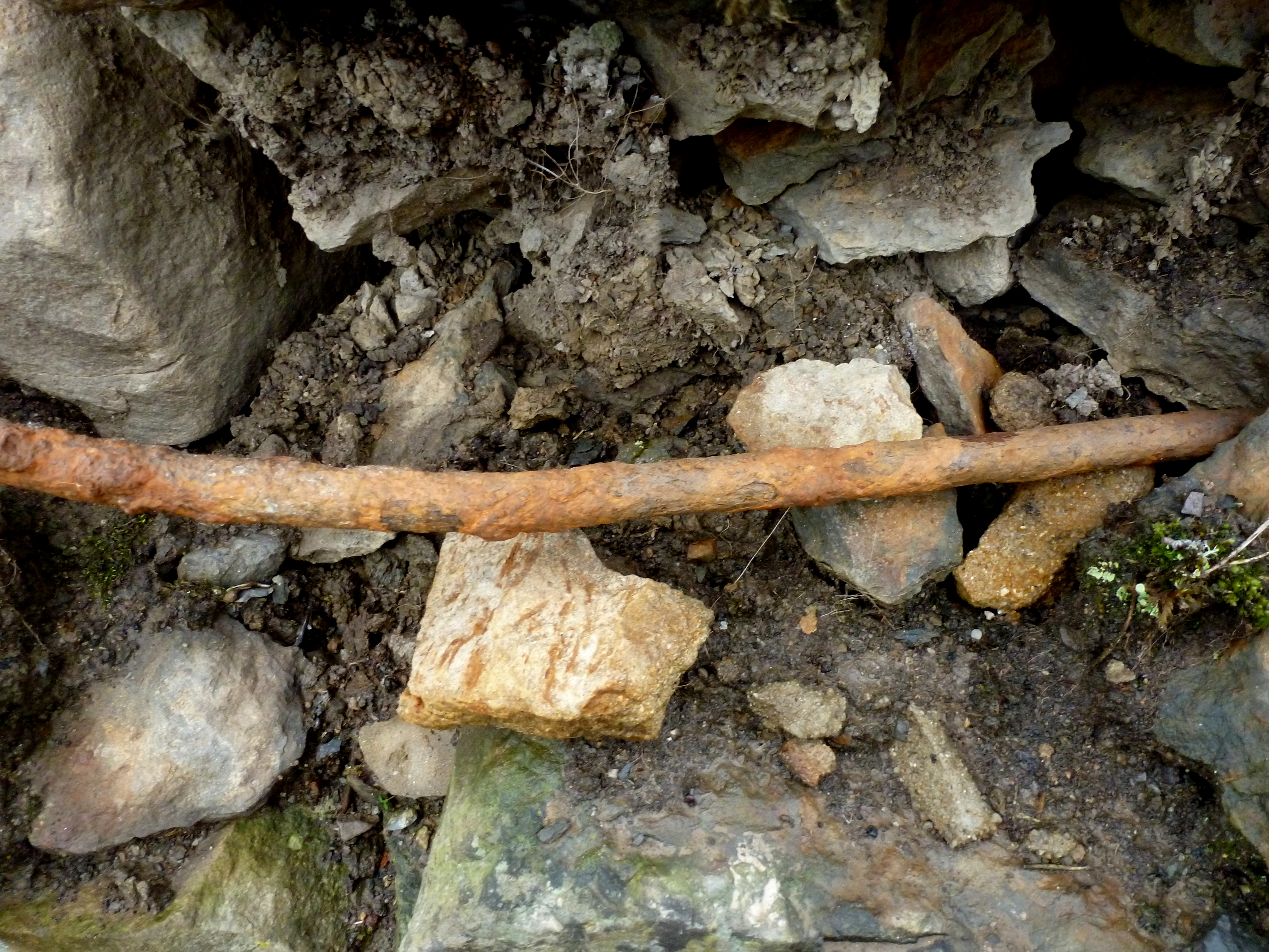 When we took stone from collapsing ancient walls close by (pre famine) this cache of metal objects was found within the wall.  It’s as if they were deliberately placed together. Metal was seen as a protective device, to ward off evil, and although these objects are not all sharp & pointy (needles, blades, nails etc) they nonetheless form a group and speak of a certain way of life.This copper object (lid of a fancy jar or pocket watch?) was found glued with mud mortar to the face of a flat stone within the west gable.