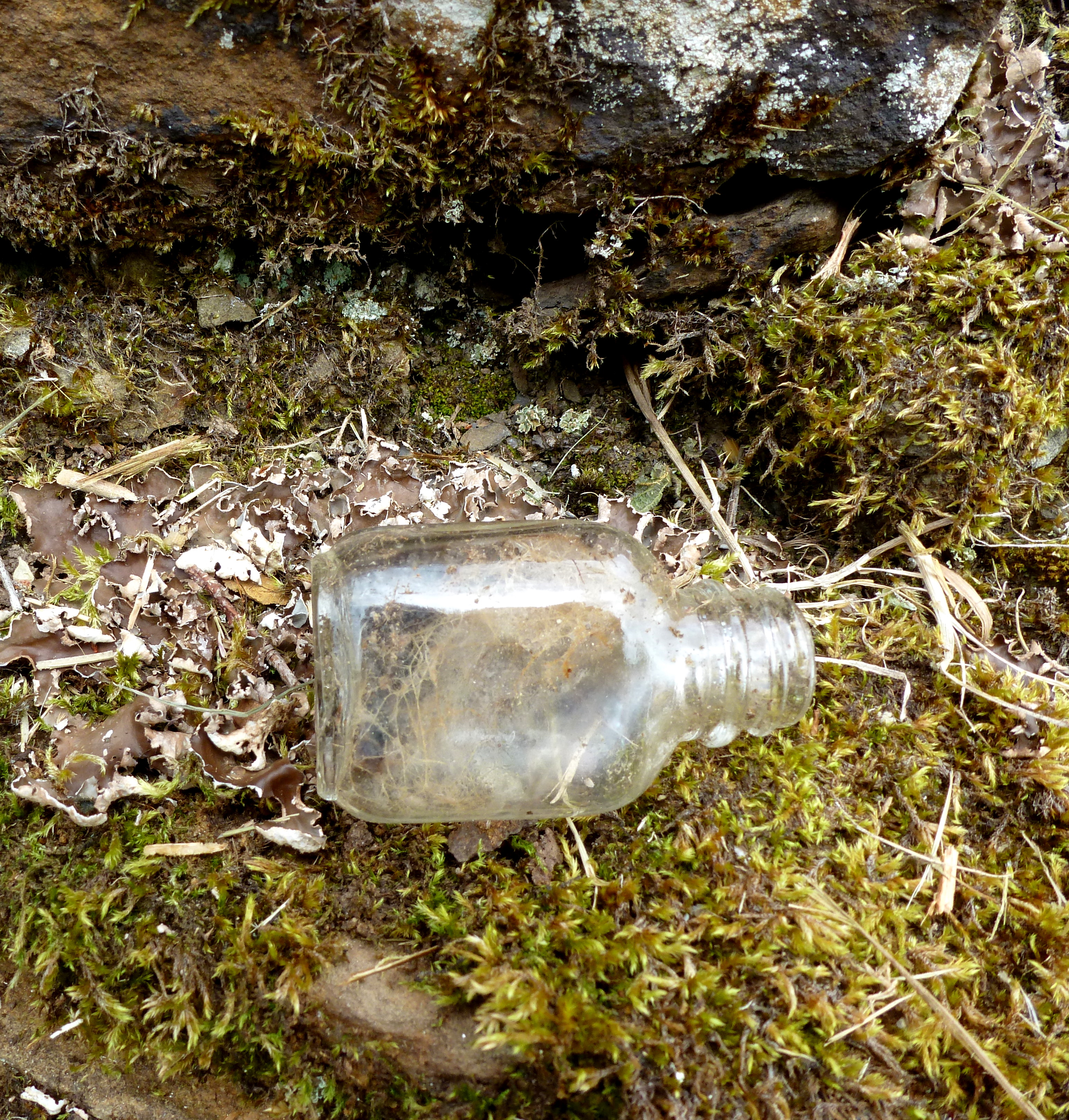 Bottles – often containing traces of urine and hair, spells against evil – were hidden inside walls. Shoes also were a commonly hidden item, perhaps to symbolize tramping upon evil.  A calf’s foot was another traditional item, perhaps for its similar tramping qualities. I have read of bulls & pigs hearts pierced full of pins, found hanging inside old chimneys.