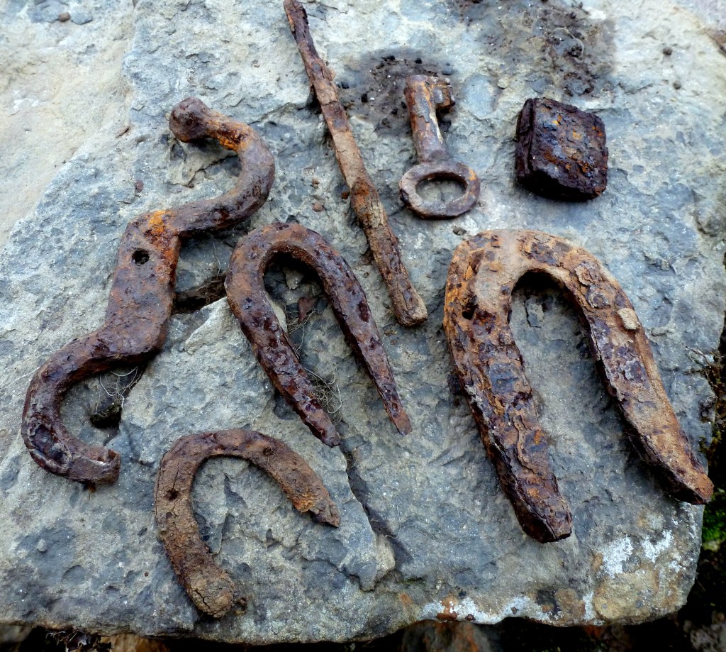 1. The top left object seems to be a latch, for a gate rather than a door judging by the weight. A donkey shoe (narrow, above) and pony shoe (rounder beneath) but that really large, and thick, U shape – can it be a shoe? The turned right tip suggests a tethering device or bracket.