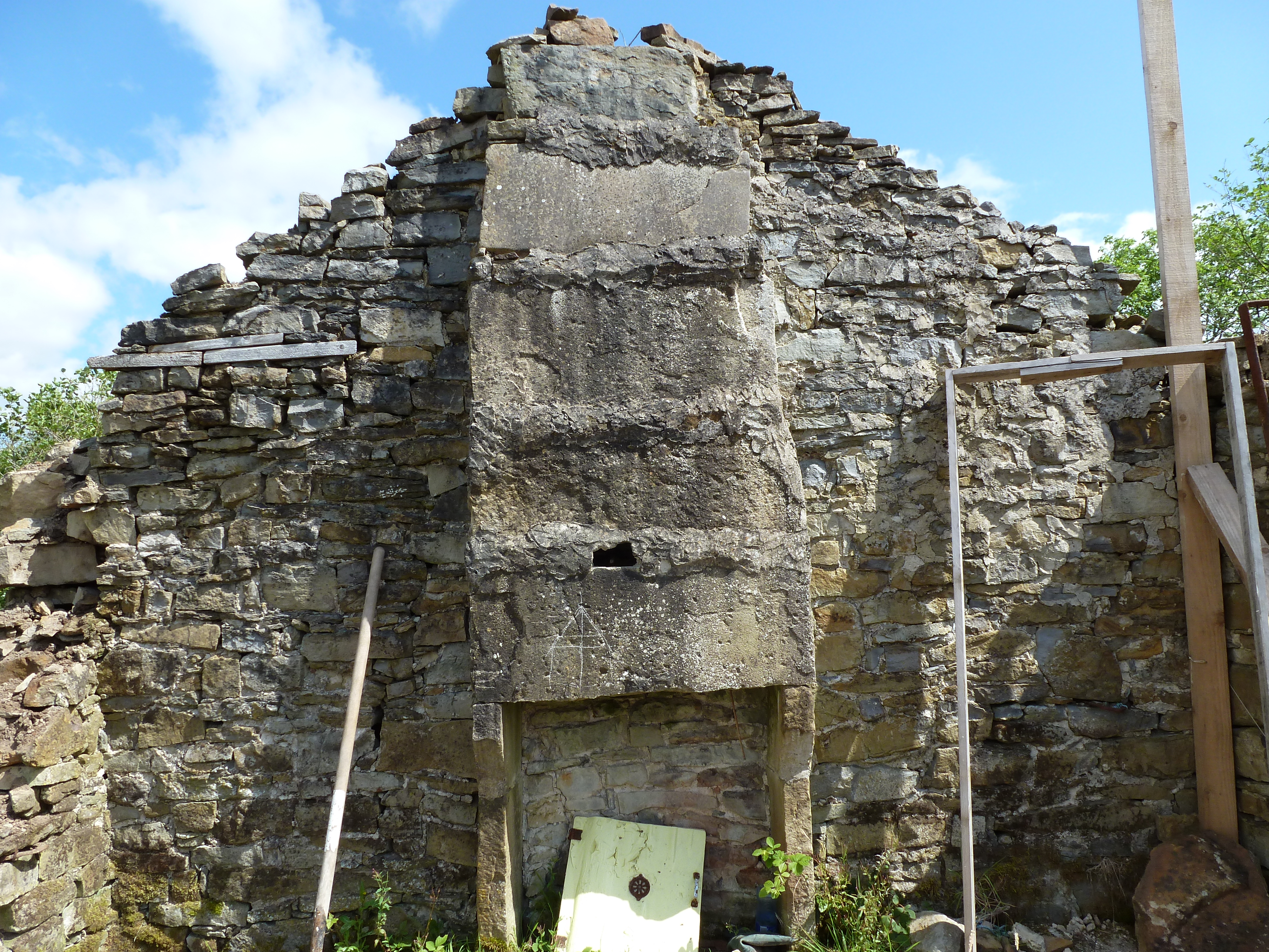 We discover that our lintels fall short of the full width of the wall. Originally they were compensated by timber. Very handily, our friendly neighbourhood quarryman, Kerrigan, dropped off a new lintel ready dressed. We deduced that our original lintels, (and probably the majority of this byre’s stone), had been recycled from a nearby ruined cottage – ‘Shane’s’ cottage (below) named so because of the resident on the Tithe Applotment Books (1823-38) & Griffith Valuation; Shane Hegarty.