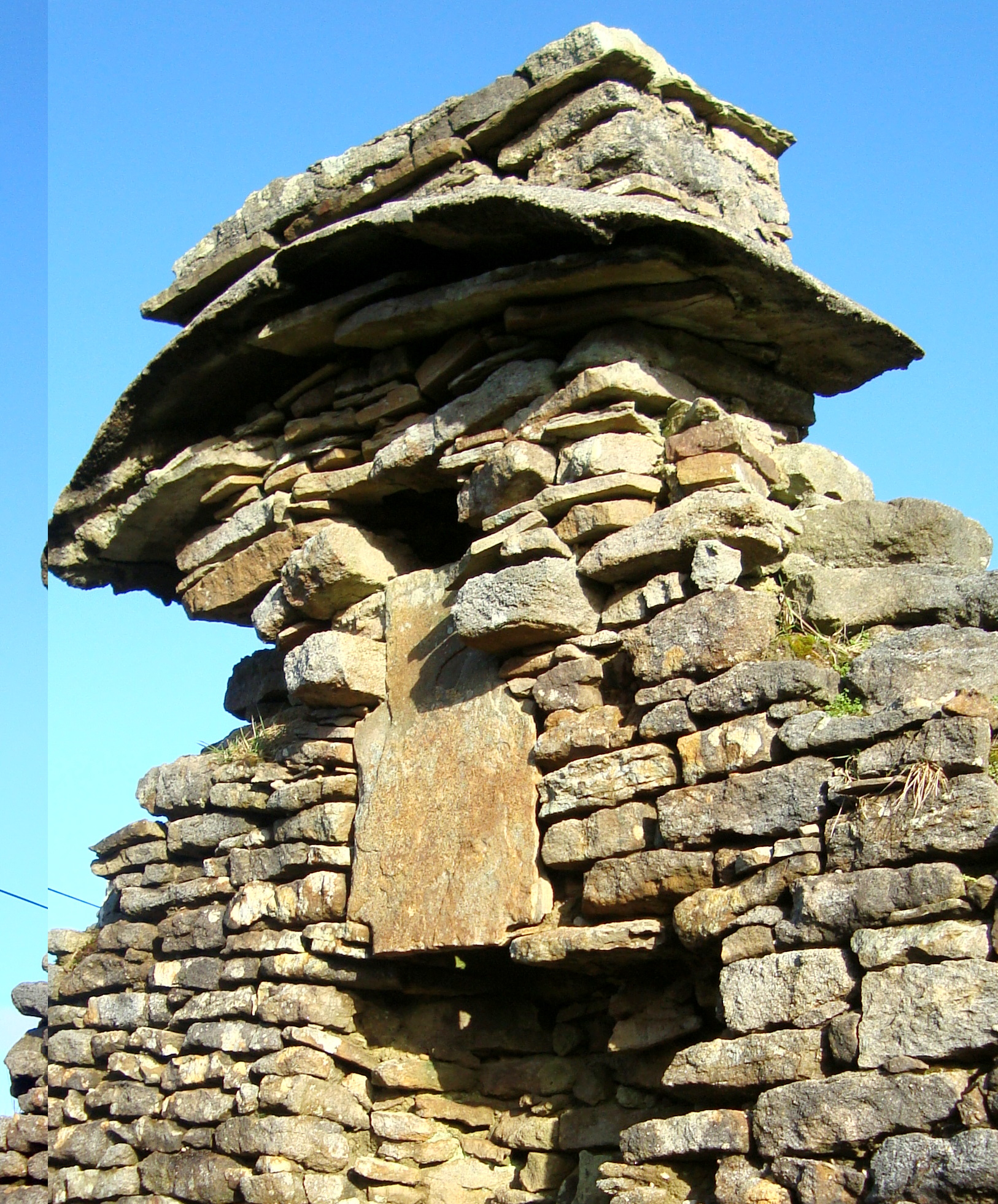 An alternative method was to cut a niche into flag corners thus dispensing with the gap. In the above chimney only the smallest flag remains, and commonly this was cut with corner slots. However it was a more rare undertaking for large, valuable flags to be jeopardized by cutting. (Note the curved cap of lime mortar which would have embraced thatch on a ‘hipped’ roof.)