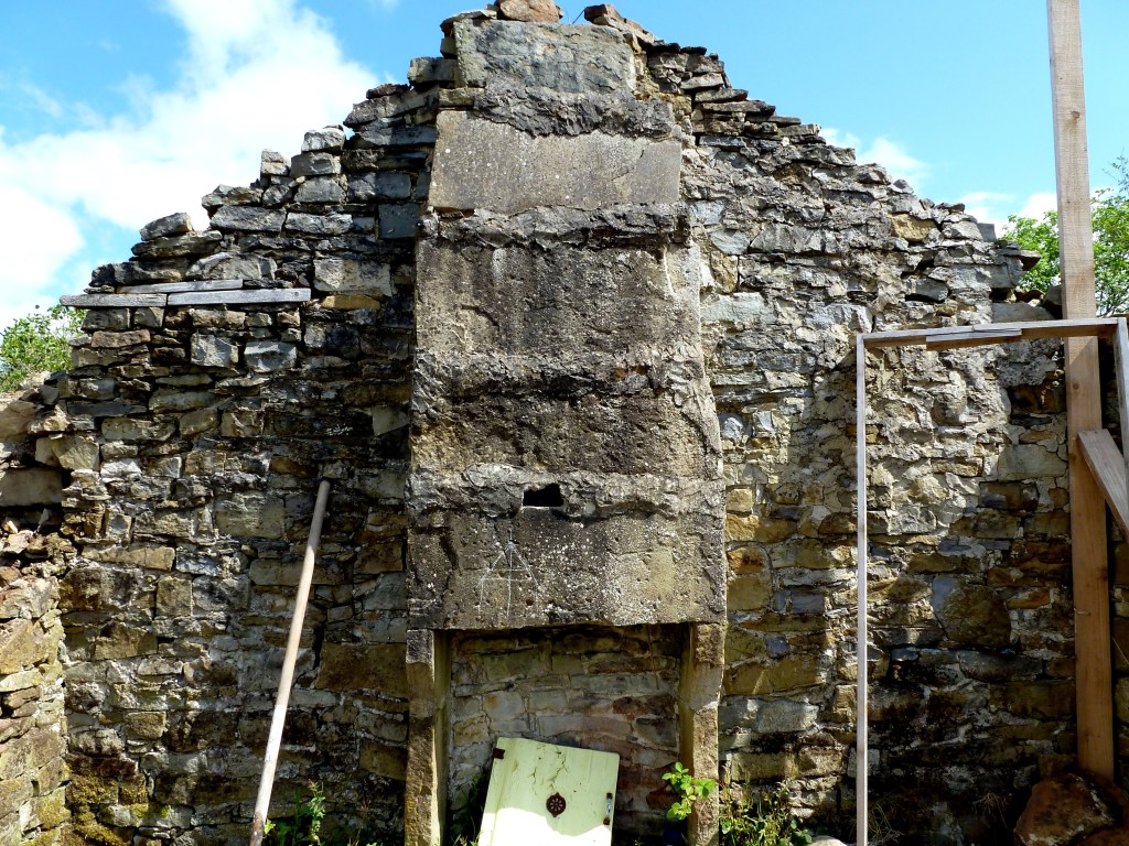 Consisting of five flags, the largest rests upon buttresses of cantilevered stone. Each subsequent flag sits upon a couple of long, narrow tie stones, and are tilted to be slightly outward slanting. The thresher byre gable (above) shows gaps between flags which have been slathered with cement after losing their original masonry.Looking at a similar construction (above) we see some surviving small stones used to close gaps between flags, but in conjunction with the fire’s heat these stones were vulnerable and could work loose.