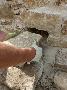 He chisels out a stone from the gable wall and also the surrounding lime mortar