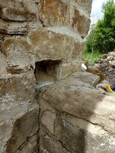 Our lower room has reached window height (3.5 ‘) to the south of the building (see above – left wall) and on the opposite northern wall Kieran works at tying the lower room into the fireplace gable.