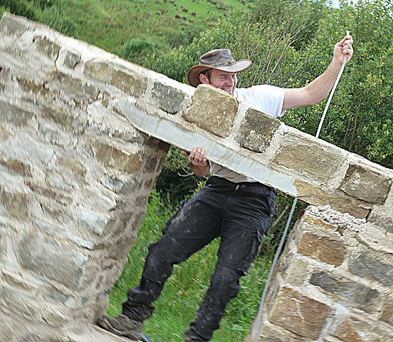 ..we use a water level – a clear plastic pipe filled with water. Kieran holds it (at eye level) to where the water level matches the correct wall top height.