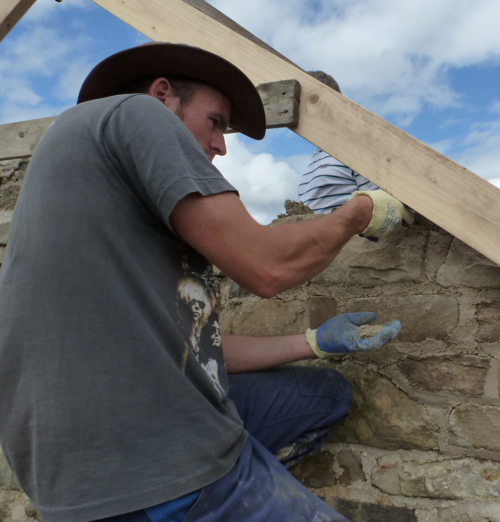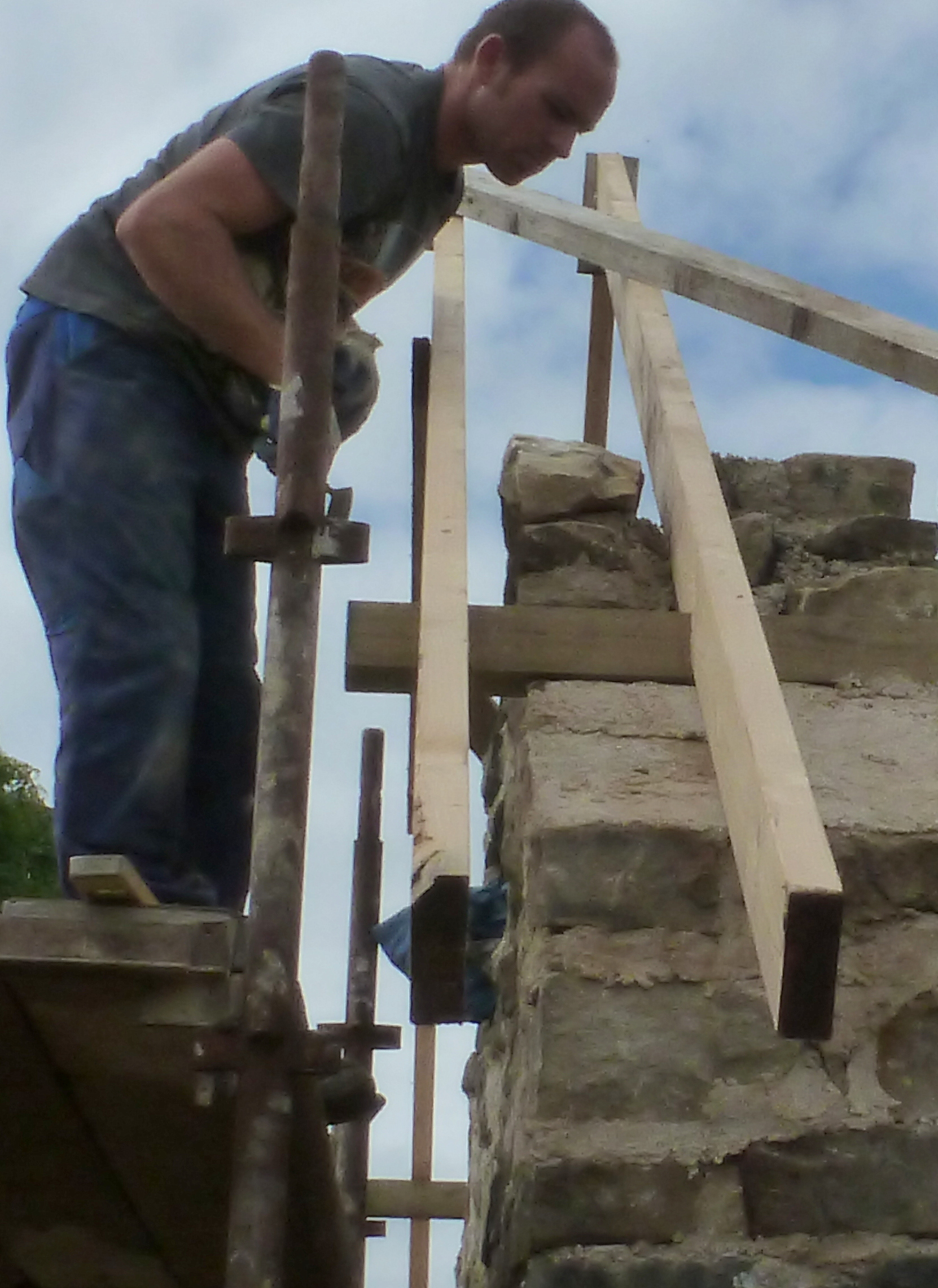 Of these two rafters only one is permanent and built into the shoulder of the gable. The rafter closest to Kieran will be removed later.