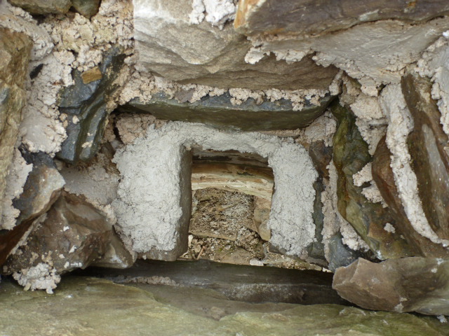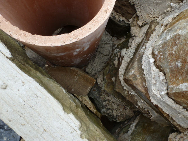 Set the pipe in place and level it – then fill all gaps with slips of stone loosely placed around the lip of the pipe with a wee bit of mortar (below).