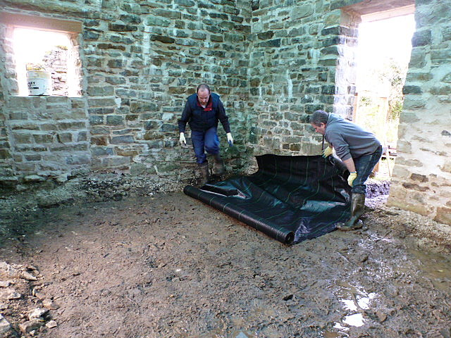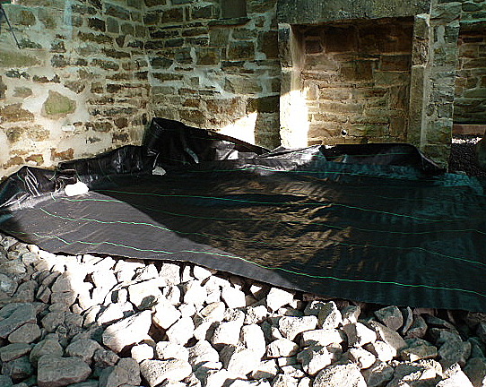 Firstly we lay a breathable membrane on virgin ground. Remember that we have dug down to a depth of two feet below finished floor level. The membrane will stop silt from rising up.