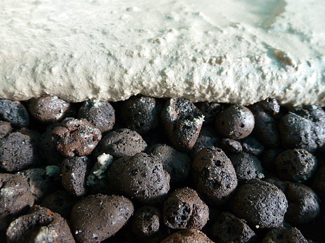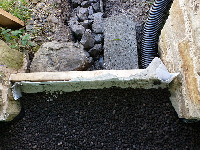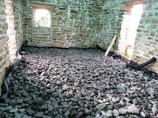 5. Hi there, i have been fascinated by the floor you have constructed here, and i am now trying to source similar materials, the lime stone 75mm has been sourced easy, i am now struggling with the light weight expanded clay, i am guessing that it must be available in builders ton bags ? also is there a trade name for it ? i have found a trade name leca struggling to find a supplier in lancashire area, local builders merchants (travis perkins) recommended vermiculite balls, im thinking vermiculite is absorbant of moisture ? what make is the membrane, i am curious to ask, has it been succesful? is the flag floor dry and warm, sorry to be going on ! in one of the pictures i can see what i think is a black flexi pipe poking out of the floor, what is this for ? i work for a company that sells and moves bulk aggregates and my boss is adamant i need visqueen and concrete pouring over the top, when i explain that this will force water into my random stone walls and make it worse he thinks i have lost my marbles, lol, any advice will be glady recieved