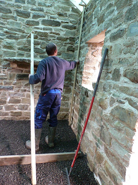 The other vital point is to dig out the existing floor at a 45% angle from your walls, (not straight down, as you might do for a conventional building) – as generally there are no foundations & you risk destabilizing the wall.