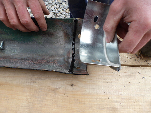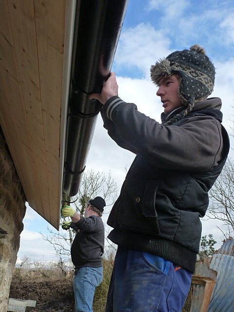 This heavy 1960s galvanised guttering turns up. With cold-numb hands it is stripped back, re-painted, then mounted.