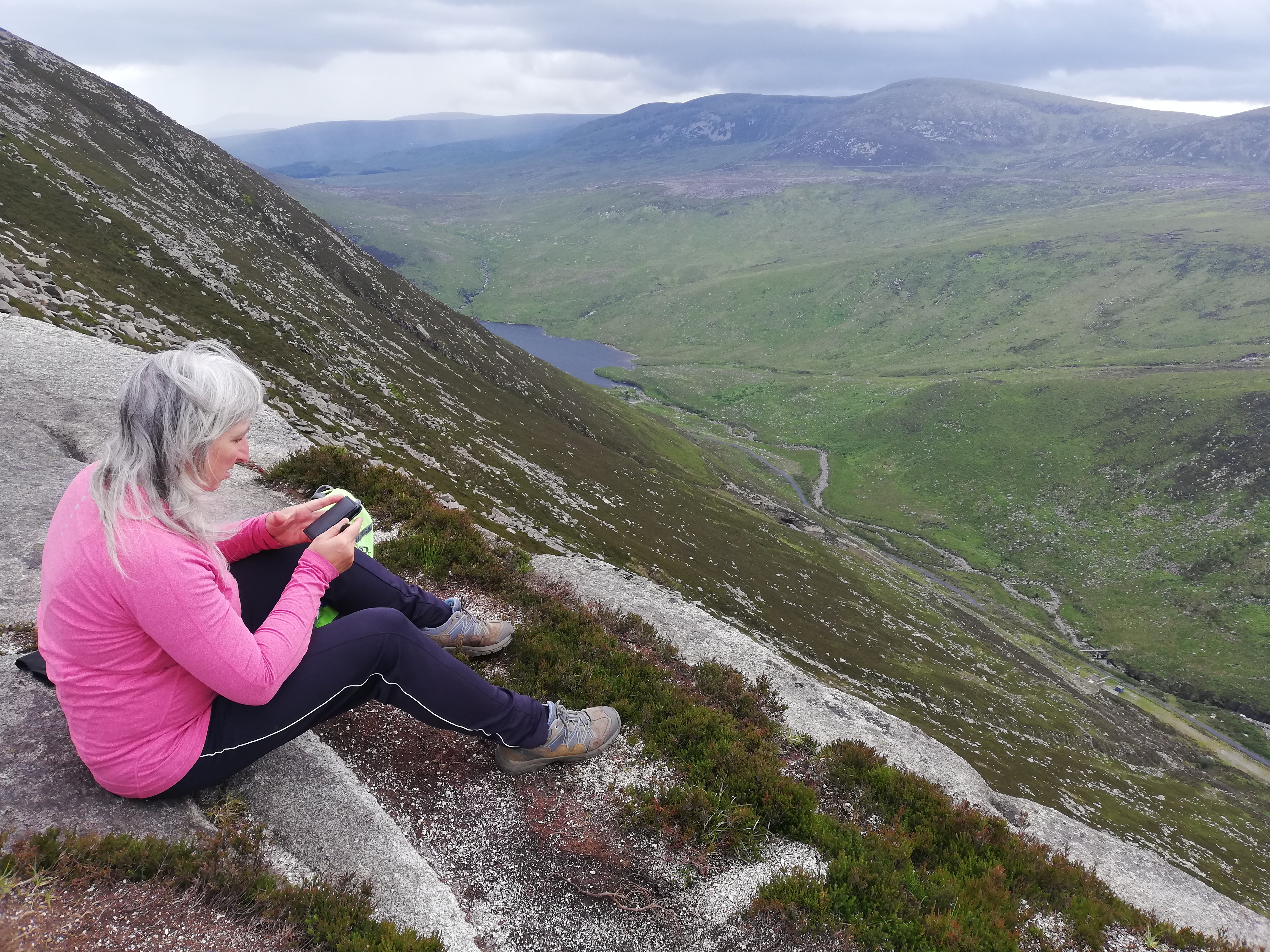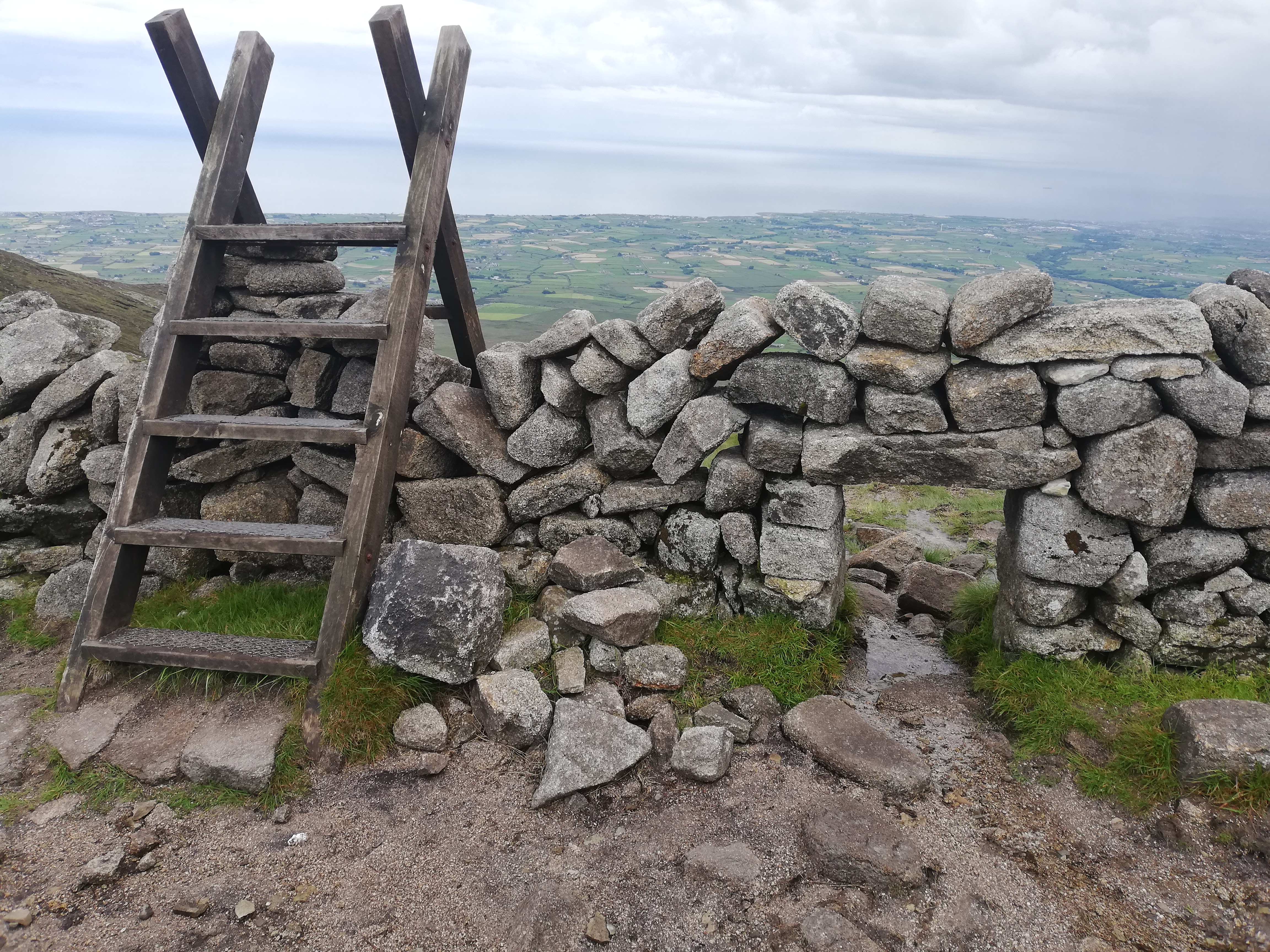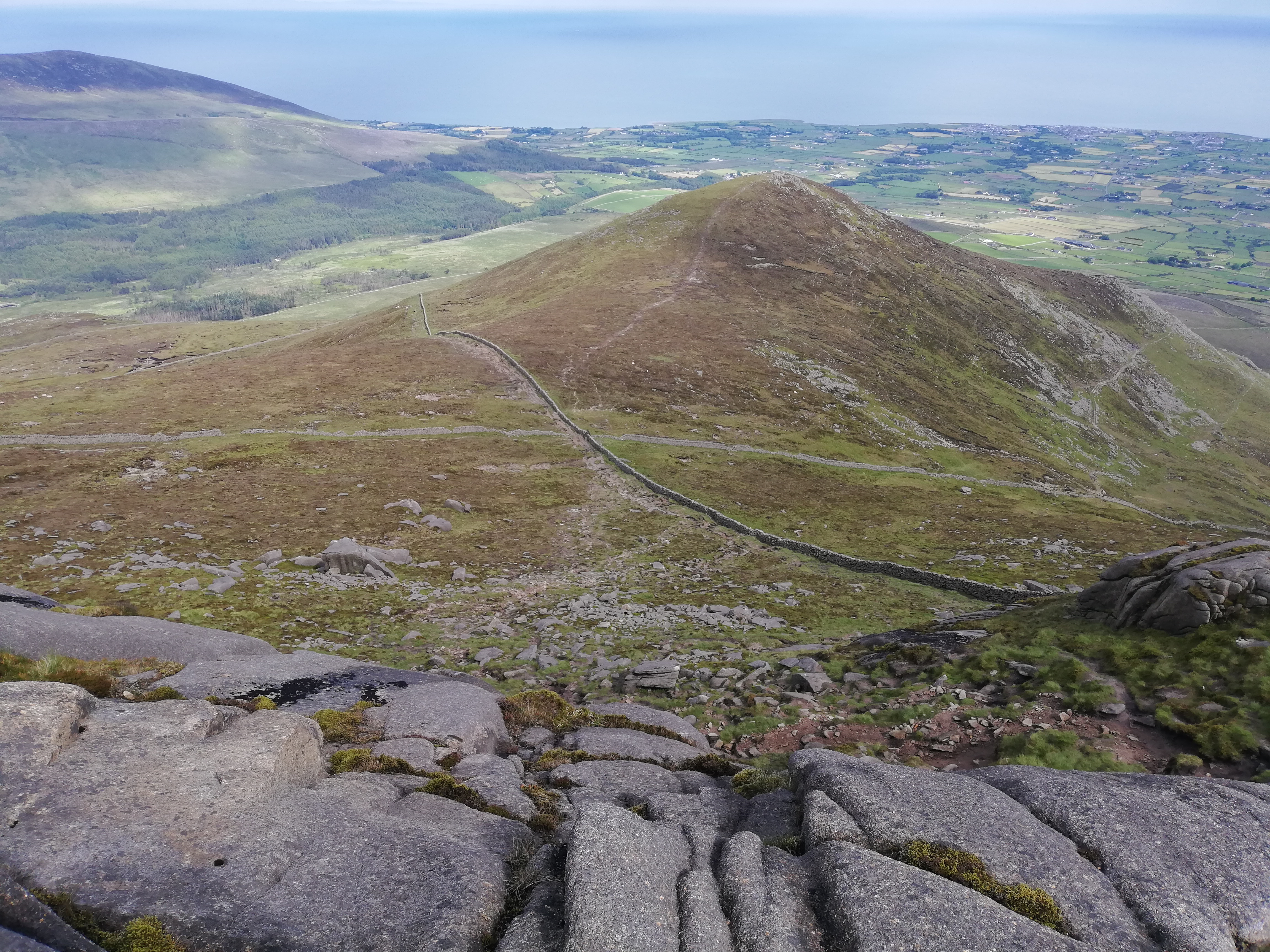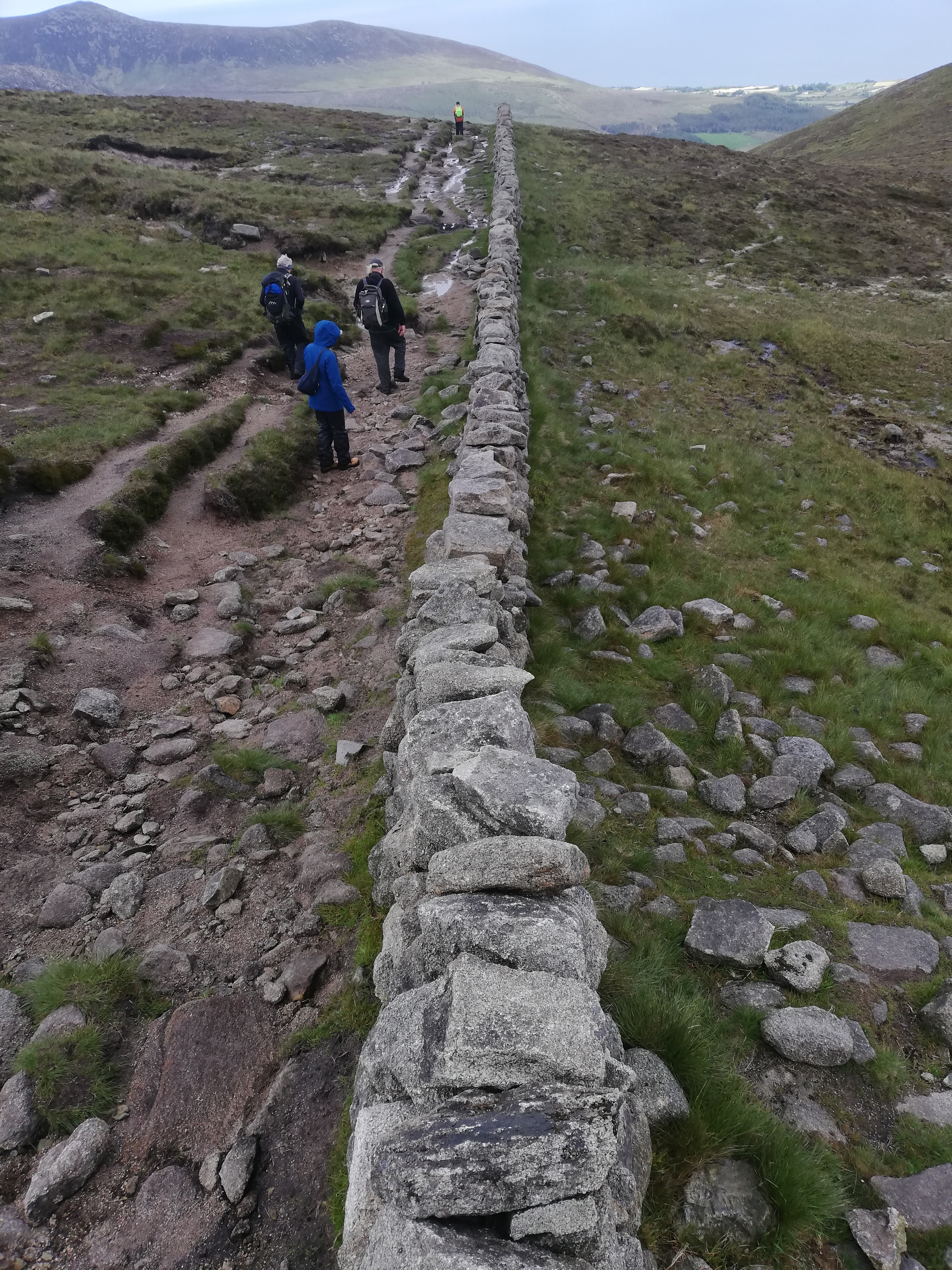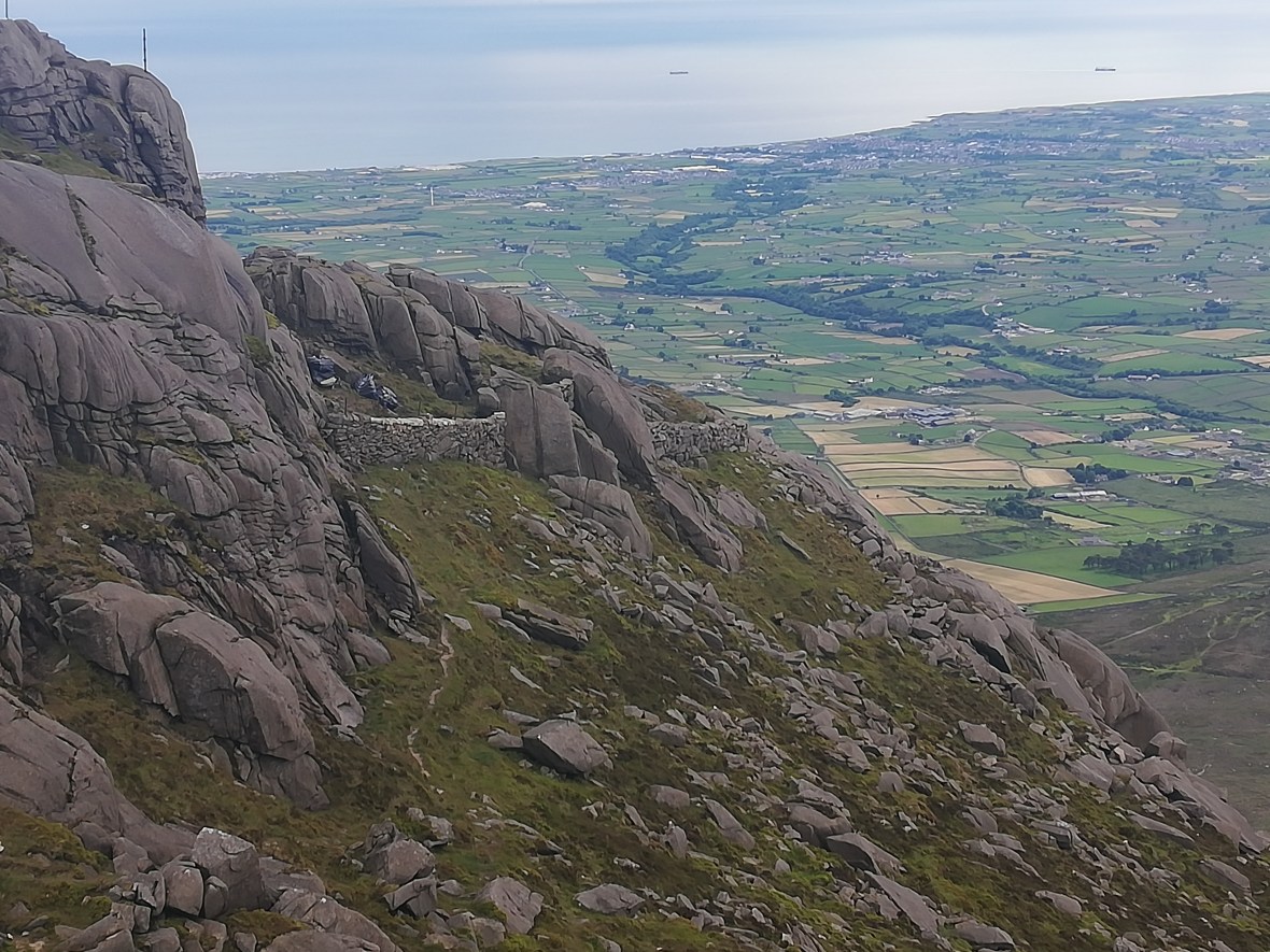 We tackle Slieve Binnian (747 m) in order to get a closer look at the Mourne Wall. You can see the reservoir and water supply for Belfast beyond, which the wall was built to protect from livestock.