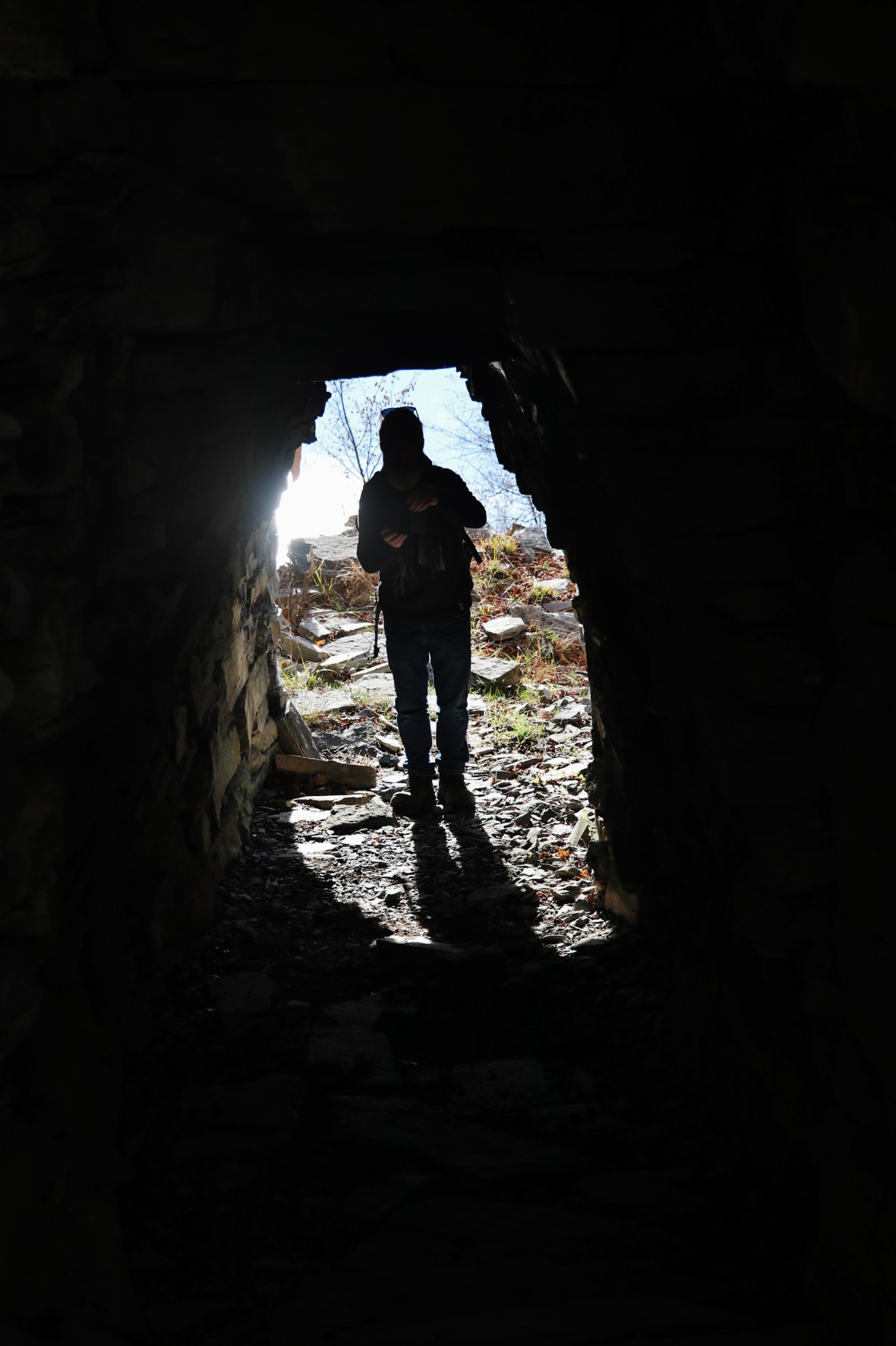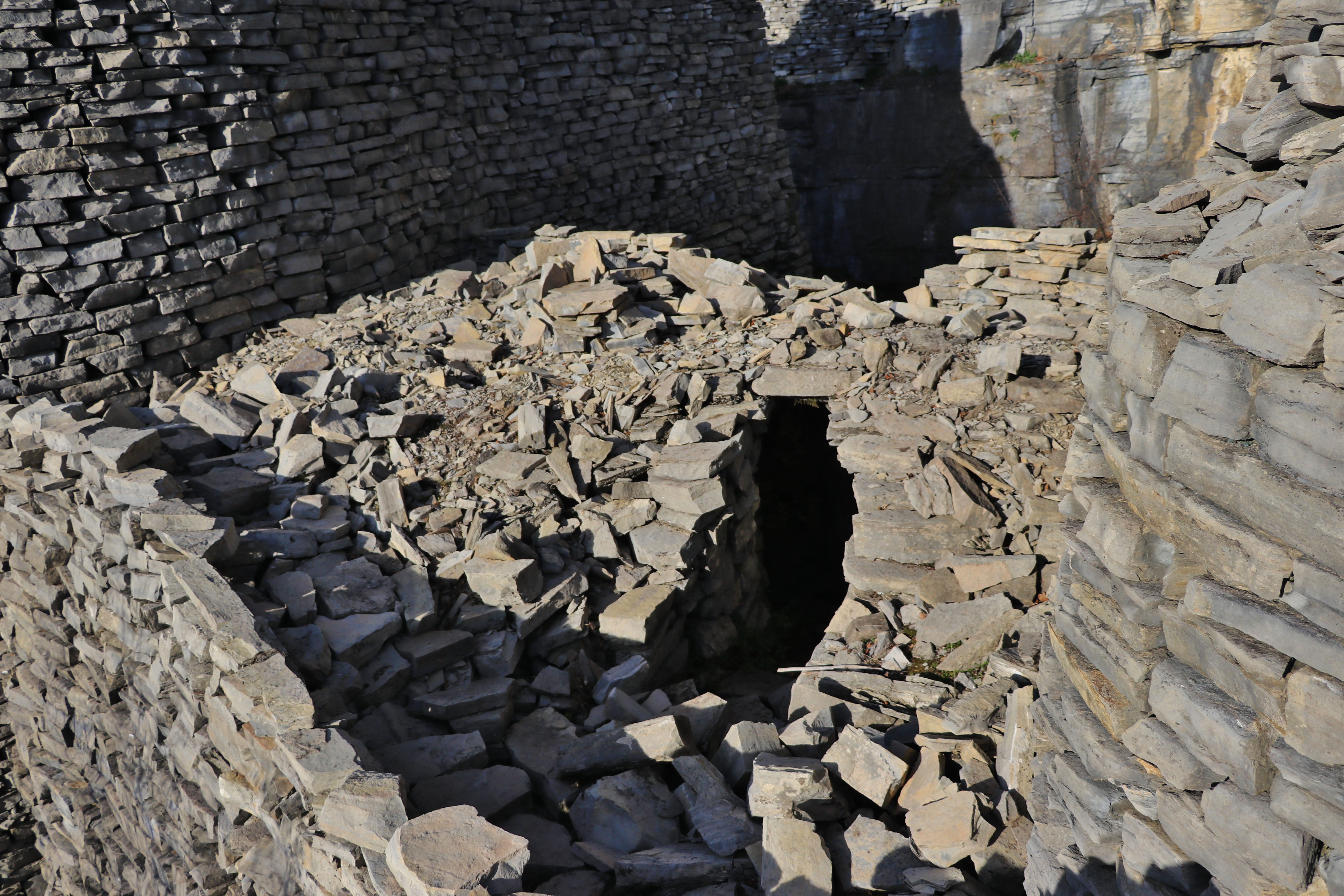 The tunnels were the route to haul stone from the quarry face through the debris buildings. This was done by sledge, pulled by mules and donkeys, or by the men themselves.